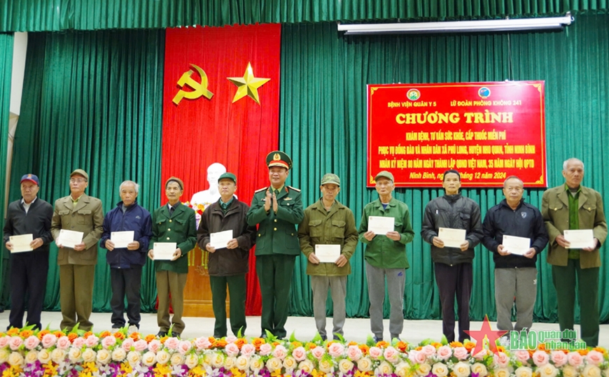 Sáng 21-12, nhân kỷ niệm 80 năm Ngày thành lập Quân đội nhân dân (QĐND) Việt Nam (22-12-1944/22-12-2024) và 35 năm Ngày hội Quốc phòng toàn dân (22-12-1989/22-12-2024), Bệnh viện Quân y 5, Cục Hậu cần - Kỹ thuật và Lữ đoàn Phòng không 241, Quân đoàn 12 tổ chức chương trình khám bệnh, tư vấn sức khỏe, cấp thuốc miễn phí, tặng quà cho thương binh, bệnh binh, gia đình chính sách, gia đình người có công với cách mạng tại xã Phú Long, huyện Nho Quan, tỉnh Ninh Bình. Thiếu tướng Nguyễn Thanh Tình, Phó chính ủy Quân đoàn 12 dự chỉ đạo.