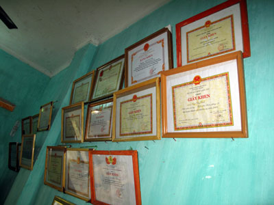 Nhiều bằng, giấy khen và danh hiệu Chiến sĩ thi đua của Ngô Văn Vinh trong căn nhà nhỏ của vợ chồng anh.