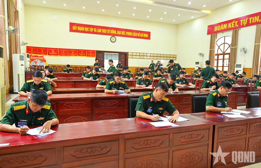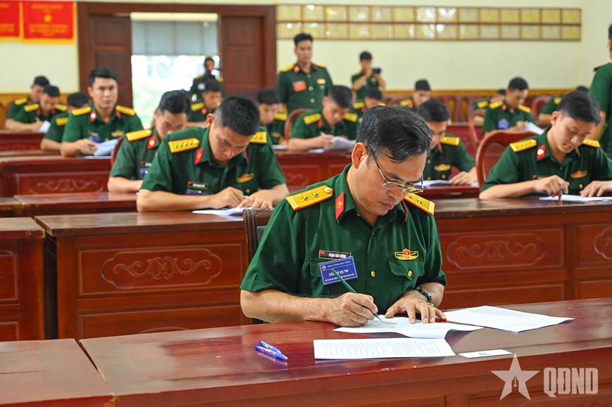 Cán bộ dự thi làm bài kiểm tra nhận thức chung về Điều lệnh quản lý bộ đội, các văn bản về xây dựng chính quy, quản lý kỷ luật. |