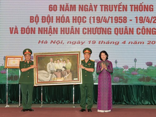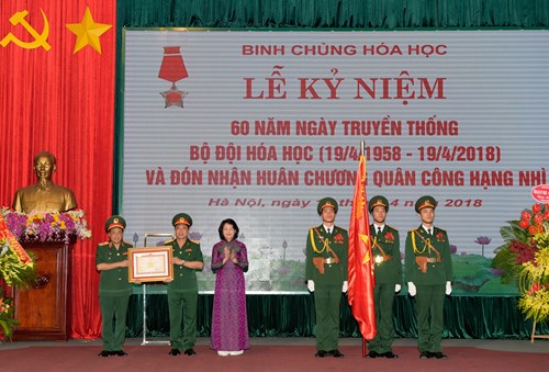 Tại Lễ kỷ niệm, Phó Chủ tịch nước Đặng Thị Ngọc Thịnh đã gắn Huân chương Quân công hạng Nhì lên Quân kỳ Quyết thắng của Binh chủng Hóa học. Đây là phần thưởng thể hiện sự ghi nhận, đánh giá cao và niềm tin yêu của lãnh đạo Đảng, Nhà nước đối với sự nỗ lực phấn đấu và những đóng góp tích cực, có hiệu quả của Binh chủng Hóa học đối với sự nghiệp xây dựng và bảo vệ Tổ quốc trong những năm qua./.