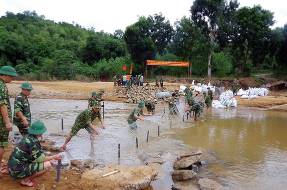 Cán bộ, chiến sĩ Lữ đoàn Xe tăng 215 giúp nhân dân khắc phục thiệt hại do mưa lũ xây dựng cầu tạm tại xã Tân Long, Hướng Hóa. |