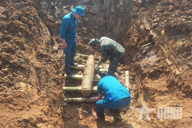 Bộ đội, dân quân tiến hành đào hầm và vận chuyển bom đến vị trí xử lý.