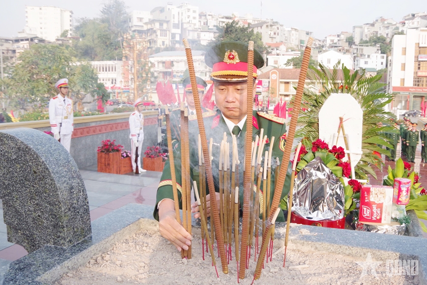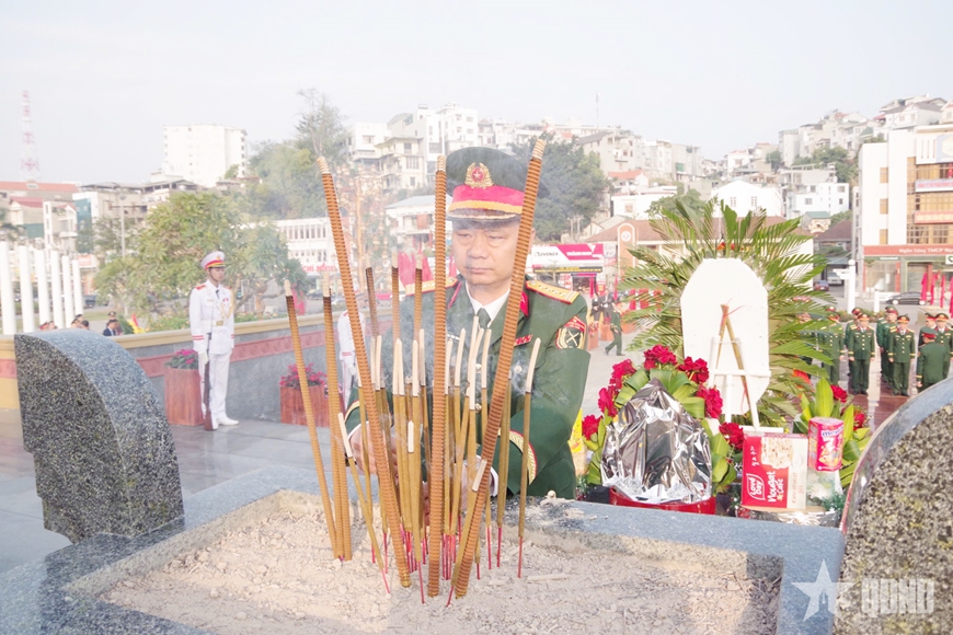 | Đại tá Hoàng Văn Thuyết, Chính ủy Bộ CHQS tỉnh Quảng Ninh, dâng hương tại Đài tưởng niệm các Anh hùng liệt sĩ (phường Hồng Gai). |