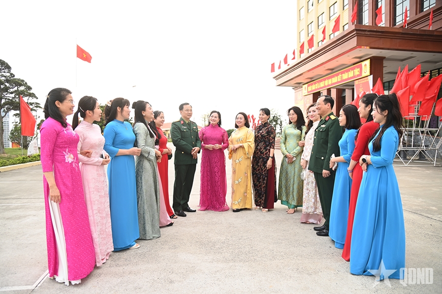| Đại tá Hoàng Văn Thuyết, Tỉnh ủy viên, Phó bí thư Thường trực Đảng ủy, Chính ủy Bộ CHQS tỉnh; Thượng tá Nguyễn Văn Việt, Phó chính ủy Bộ CHQS tỉnh, trò chuyện cùng cán bộ, hội viên Hội phụ nữ cơ quan Bộ CHQS tỉnh. |