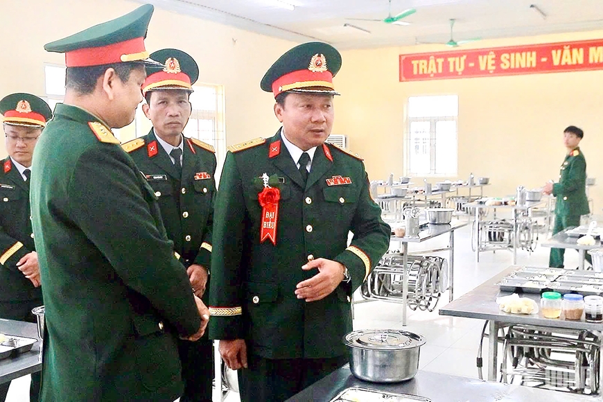 | Đại tá Lê Trọng Hòa, Ủy viên Ban Thường vụ Tỉnh ủy, Chỉ huy trưởng Bộ CHQS tỉnh Quảng Ninh kiểm tra khu vực nhà ăn của chiến sĩ mới. |
