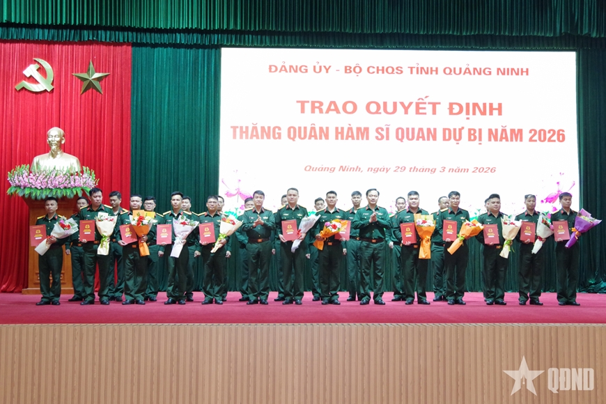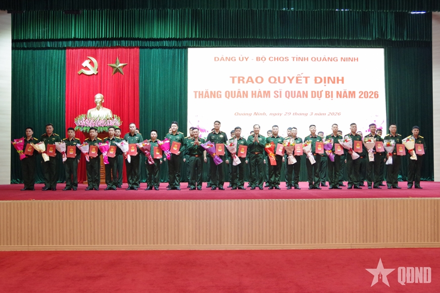 Cũng trong sáng cùng ngày, Đảng ủy - Bộ CHQS tỉnh Quảng Ninh đã trao quyết định thăng quân hàm sĩ quan dự bị năm 2026 cho 59 đồng chí được gọi vào phục vụ tại ngũ.