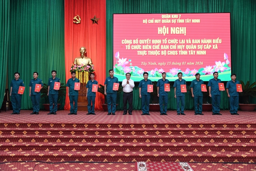 Hội nghị đã công bố các quyết định về việc tổ chức lại Ban CHQS cấp xã, phường và ban hành biểu tổ chức biên chế mới, nhằm kiện toàn tổ chức, nâng cao chất lượng đội ngũ cán bộ, đáp ứng yêu cầu, nhiệm vụ quân sự, quốc phòng trong tình hình mới.