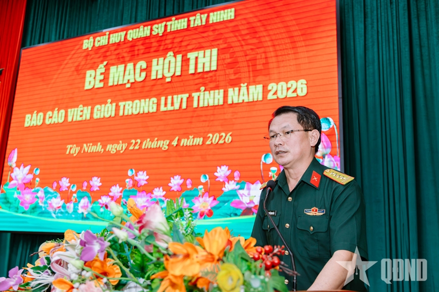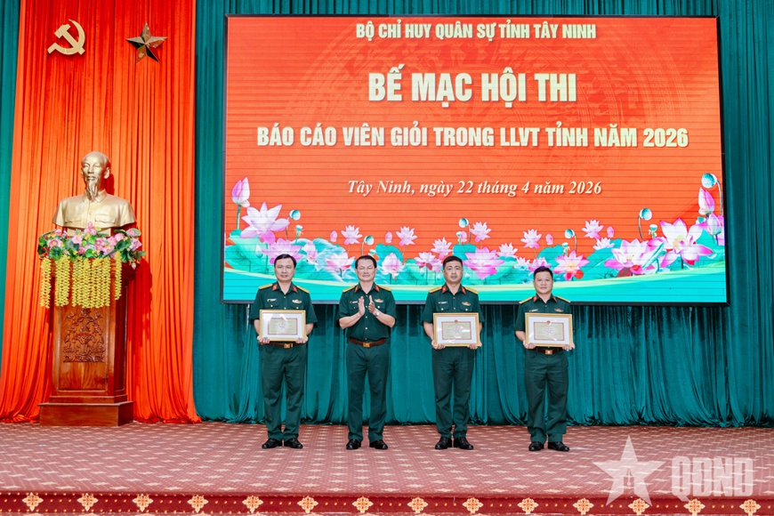Bộ CHQS tỉnh Tây Ninh đã tặng giấy khen cho các tập thể, cá nhân có thành tích xuất sắc; trao giấy chứng nhận “Báo cáo viên giỏi” cấp Bộ CHQS tỉnh năm 2026 cho 23 thí sinh có tổng điểm trung bình từ 8,5 trở lên.