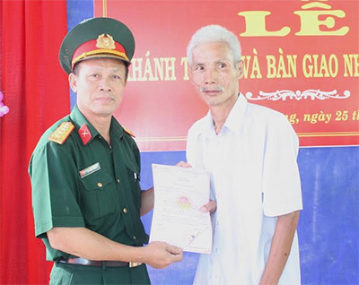 Đại tá Lê Ngọc Thanh – Phó chính ủy Bộ CHQS tỉnh Thừa Thiên – Huế trao quyết định tặng nhà cho đồng chí Phan Dân.