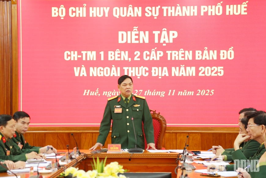 Trong hai ngày 26 và 27-11, Bộ Chỉ huy Quân sự (CHQS) TP Huế tổ chức diễn tập Chỉ huy tham mưu (CH-TM) 1 bên, 2 cấp trên bản đồ và thực địa năm 2025. Dự và chỉ đạo diễn tập có Đại tá Phạm Văn Dũng, Phó tham mưu trưởng Quân khu 4; đại diện các cơ quan của Quân khu.