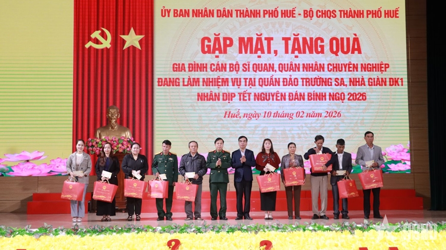 Ngày 10-2, thừa ủy quyền của UBND TP Huế, Bộ CHQS TP Huế tổ chức gặp mặt, tặng quà gia đình cán bộ sĩ quan, quân nhân chuyên nghiệp đang làm nhiệm vụ tại Trường Sa, Nhà giàn DK1 nhân dịp Tết Nguyên đán Bính Ngọ 2026.