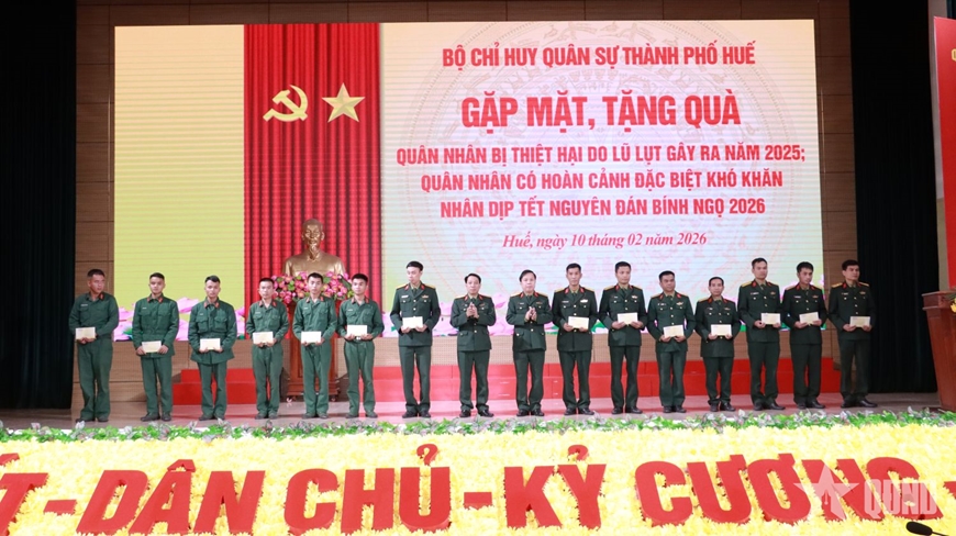 Cùng ngày, Bộ CHQS TP Huế trao 38 suất quà của Bộ Quốc phòng, Bộ tư lệnh Quân khu 4 và Bộ CHQS TP Huế tặng các đồng chí cán bộ sĩ quan, quân nhân chuyên nghiệp, hạ sĩ quan-chiến sĩ có hoàn cảnh gia đình đặc biệt khó khăn, mắc bệnh hiểm nghèo điều trị dài ngày đang công tác tại các cơ quan, đơn vị lực lượng vũ trang TP Huế; đồng thời tặng 131 suất quà cho các quân nhân có gia đình bị thiệt hại do bão, lụt gây ra trong năm 2025. Hội Phụ nữ cơ quan Bộ CHQS TP Huế trao 9 suất quà tặng các đồng chí chiến sĩ có hoàn cảnh khó khăn đang công tác tại các cơ quan, đơn vị trực thuộc.