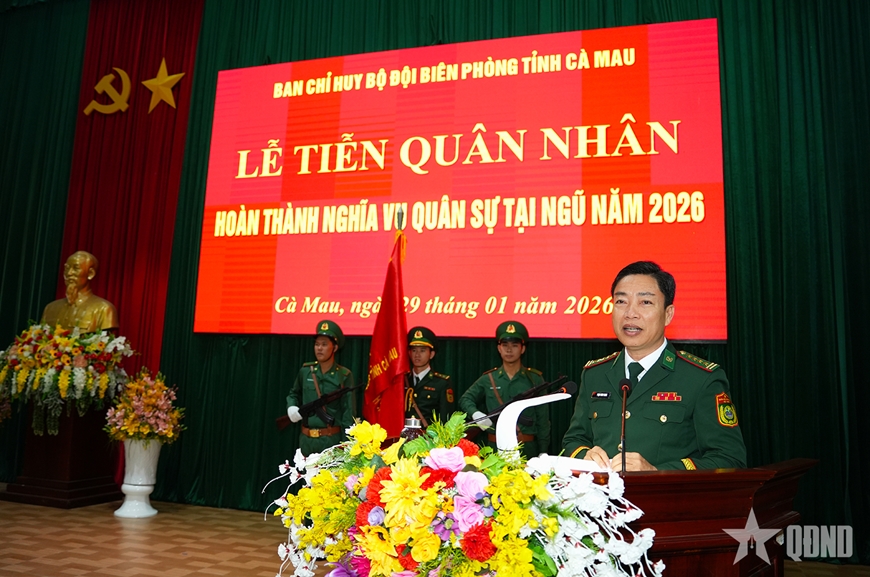 Sáng 29-1, Ban chỉ huy Bộ đội Biên phòng (BĐBP) tỉnh Cà Mau tổ chức tiễn quân nhân hoàn thành nghĩa vụ quân sự trở về địa phương. Đại tá Phạm Minh Giang, Bí thư Đảng ủy, Chính ủy BĐBP tỉnh dự và phát biểu chia tay các quân nhân.