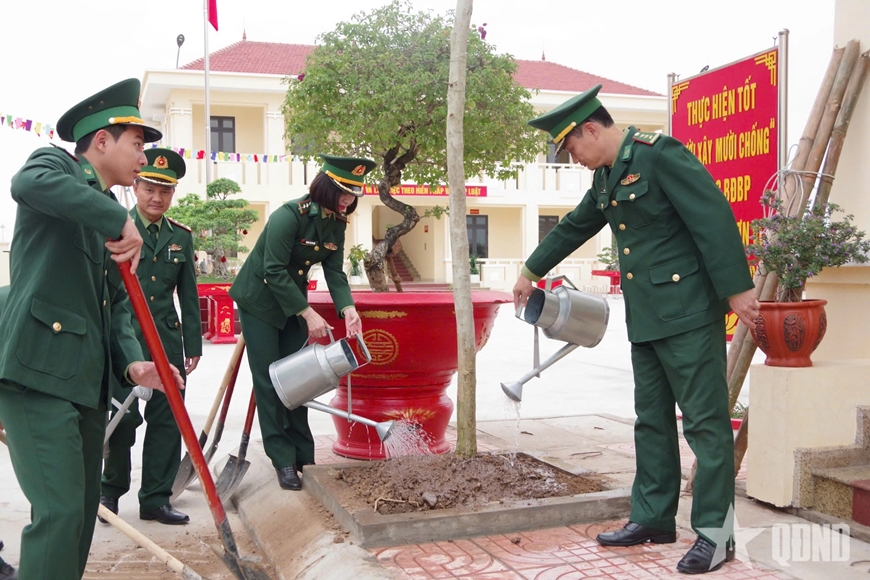 | Lãnh đạo Ban chỉ huy Bộ đội Biên phòng TP Hải Phòng cùng các đại biểu tham gia trồng cây xanh. |