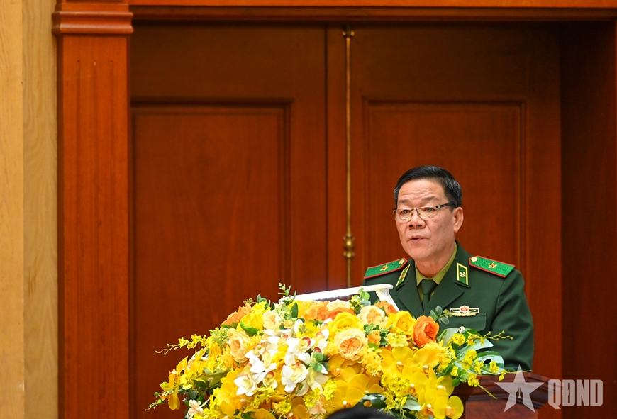 | Thiếu tướng Văn Ngọc Quế, Phó chủ nhiệm Chính trị Bộ đội Biên phòng phát biểu tại hội nghị. |