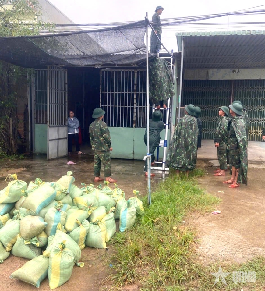 Cán bộ, chiến sĩ Lữ đoàn 573 (Quân khu 5) giúp nhân dân chằng chống nhà cửa, ứng phó với bão số 13.