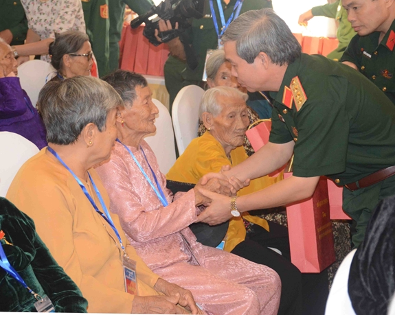 Thượng tướng Đỗ Căn trao quà Bộ Quốc phòng tặng các Mẹ VNAH. |