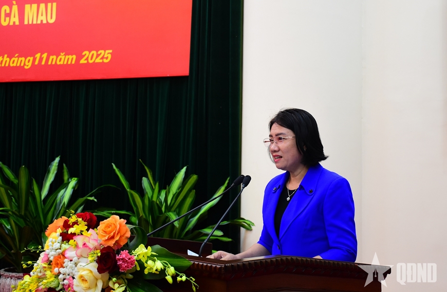 Đồng chí Nguyễn Thùy Như báo cáo tình hình thực hiện chính sách ưu đãi người có công với cách mạng của tỉnh Cà Mau.
