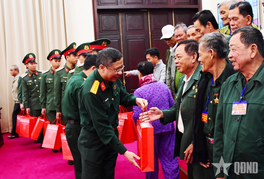 Thừa ủy quyền của Thủ trưởng Bộ Quốc phòng, Thủ trưởng Tổng cục Chính trị Quân đội nhân dân Việt Nam, Đại tá Trần Quang Thanh nhiệt liệt chào mừng, chúc sức khỏe và trao 74 phần quà tặng các đồng chí trong đoàn đại biểu người có công với cách mạng tỉnh Cà Mau.