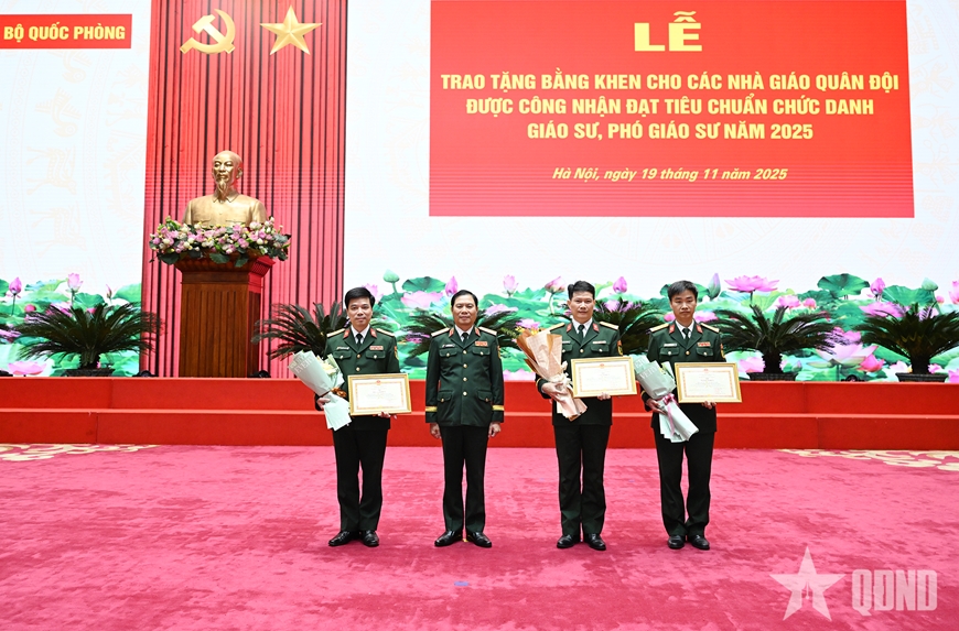 Đại tướng Nguyễn Tân Cương trao Bằng khen của Bộ Quốc phòng tặng 3 nhà giáo đạt tiêu chuẩn chức danh giáo sư năm 2025.