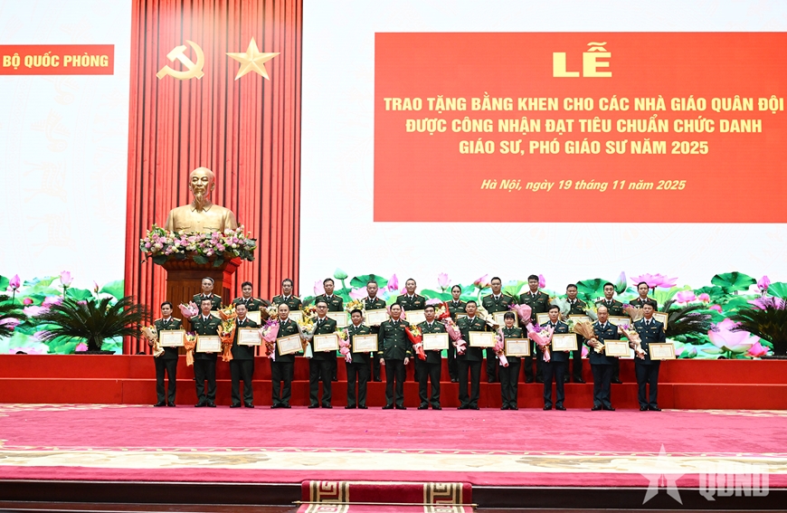 | Đại tướng Nguyễn Tân Cương trao bằng khen tặng các nhà giáo, cán bộ quản lý giáo dục đạt tiêu chuẩn chức danh phó giáo sư năm 2025. |