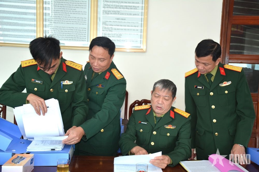 | Kiểm tra các văn kiện liên quan đến công tác quốc phòng, quân sự tại Phòng Chính trị, Bộ CHQS tỉnh Nghệ An. |