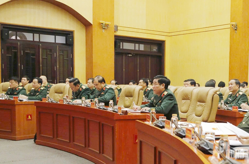 Các đại biểu dự hội nghị tại điểm cầu trung tâm ở Sở chỉ huy Bộ Quốc phòng.