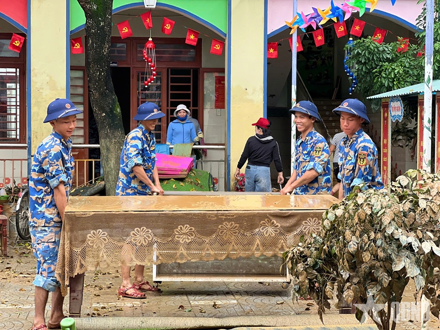 | Cán bộ, chiến sĩ Vùng 3 Hải quân giúp nhân dân khắc phục hậu quả mưa lũ do hoàn lưu bão số 12. Ảnh: KHẮC CỪ |