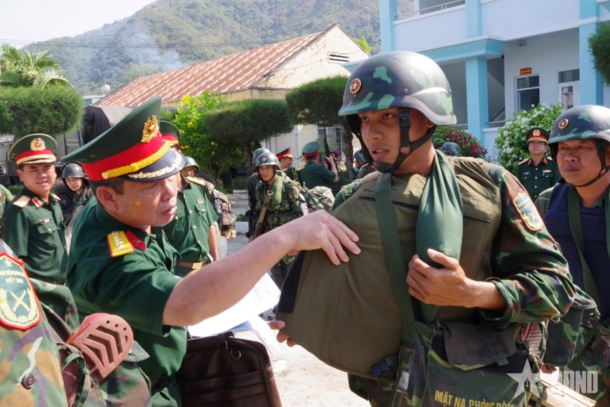 | Thiếu tướng Nguyễn Túy, Chỉ huy trưởng Bộ CHQS tỉnh Khánh Hòa kiểm tra bộ đội mang đeo trang bị. |