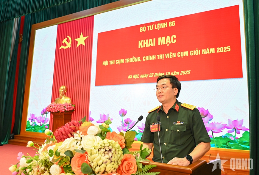 Thiếu tướng Vũ Hữu Hanh, Tư lệnh Bộ tư lệnh 86 phát biểu khai mạc Hội thi cụm trưởng, chính trị viên cụm giỏi năm 2025.