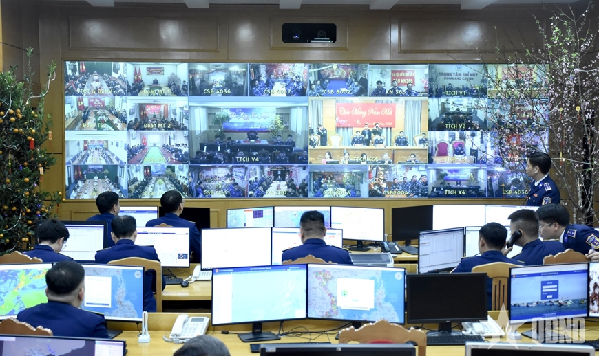 Tại Trung tâm Chỉ huy Bộ tư lệnh CSB, qua hệ thống truyền hình vệ tinh, các đồng chí trong Thường vụ Đảng ủy, Bộ tư lệnh CSB Việt Nam đã nắm tình hình, giao nhiệm vụ và chúc Tết cán bộ, chiến sĩ trên các tàu đang làm nhiệm vụ trực sẵn sàng chiến đấu, tuần tra, kiểm soát, chống khai thác IUU trên các vùng biển.