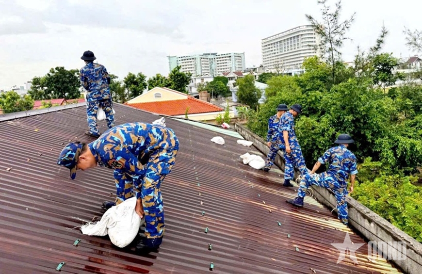 Giúp dân gia cố nhà cửa phòng tránh thiệt hại do bão gây ra. |