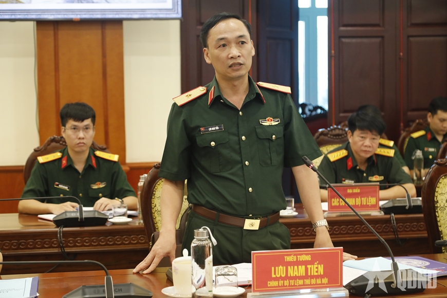 Thiếu tướng Lưu Nam Tiến, Chính ủy Bộ tư lệnh Thủ đô Hà Nội phát biểu tại hội nghị. |