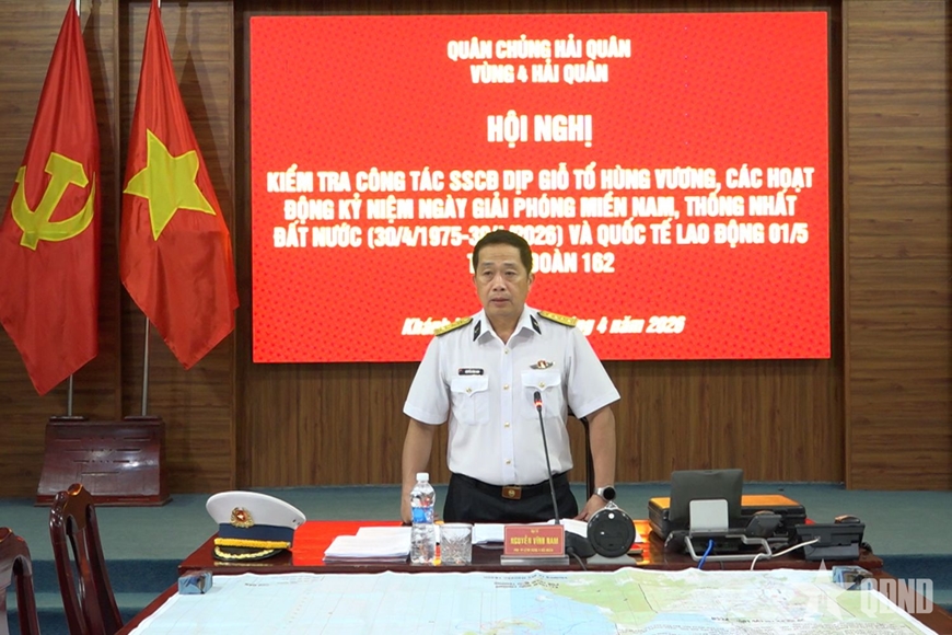 Sáng 14-4, tại Quân cảng Cam Ranh, tỉnh Khánh Hòa, Đại tá Nguyễn Vĩnh Nam, Phó tư lệnh Vùng 4 Hải quân cùng đoàn công tác Bộ tư lệnh Vùng đã đến kiểm tra công tác sẵn sàng chiến đấu bảo vệ Giỗ Tổ Hùng Vương, 51 năm Ngày Giải phóng miền Nam, thống nhất đất nước (30-4-1975 / 30-4-2026) và Quốc tế Lao động (1-5) tại Lữ đoàn 162.