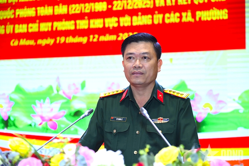 | Đại tá Võ Thành Lê, Chính ủy Bộ CHQS tỉnh Cà Mau phát biểu tại buổi gặp mặt. |