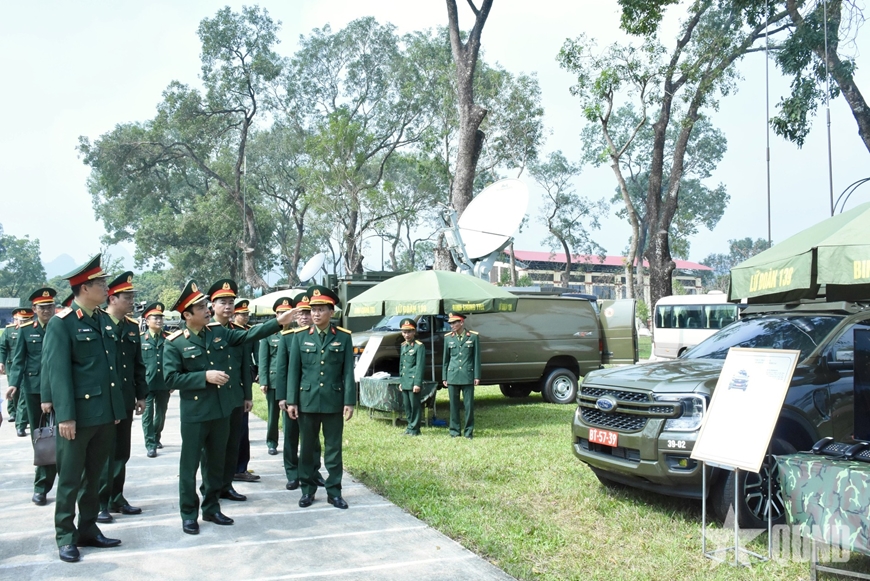 | Các đại biểu tham quan các phương tiện trang bị cho Binh chủng Thông tin liên lạc. |