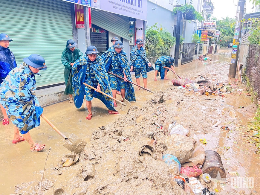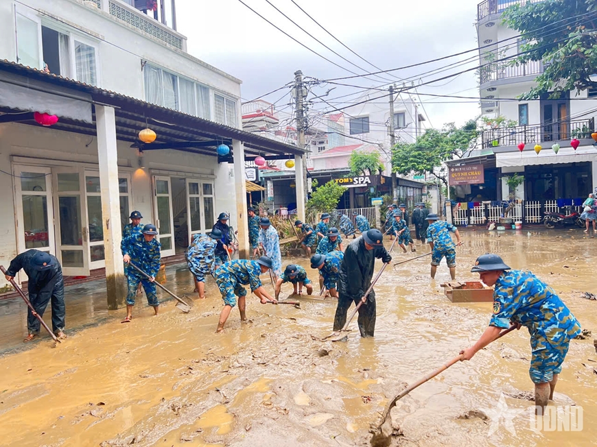 Cán bộ, chiến sĩ Trung đoàn Pháo phòng không 224 phối hợp với các lực lượng dọn dẹp bùn đất sau lũ tại phường Hội An (TP Đà Nẵng).