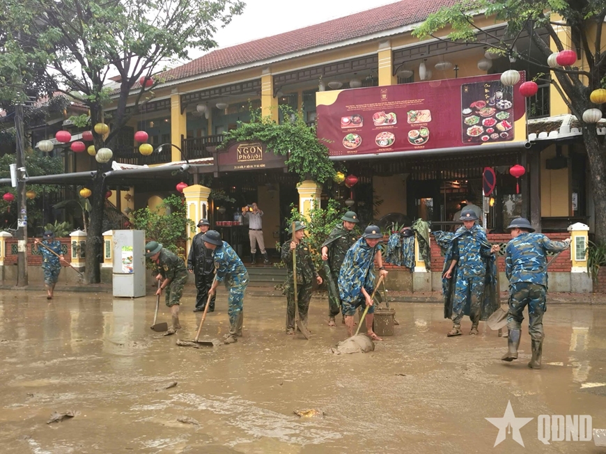 Theo đó, tại phường Hội An và xã Điện Bàn Tây (TP Đà Nẵng), cán bộ, chiến sĩ Trung đoàn Pháo phòng không 224, Trung đoàn Tên lửa 282 và Trung đoàn Radar 290 phối hợp với các lực lượng giúp địa phương tổng dọn vệ sinh môi trường, thu gom bùn đất, rác thải trên các tuyến phố, khu vui chơi giải trí, nhà sinh hoạt cộng đồng...