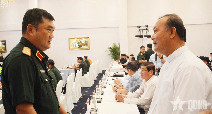 | Trung tướng Lê Xuân Thế, Ủy viên Trung ương Đảng, Tư lệnh Quân khu 7 trao đổi với các đại biểu tại buổi gặp mặt. |