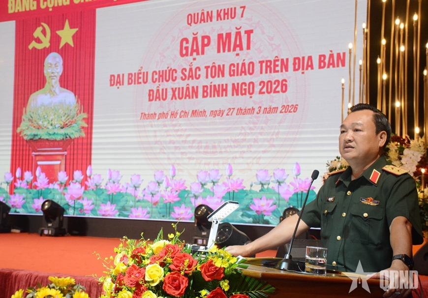 Sau khi thông tin tình hình, truyền thống, kết quả thực hiện nhiệm vụ của Quân khu thời gian qua, phát biểu tại buổi gặp mặt, Trung tướng Trần Vinh Ngọc, Bí thư Đảng ủy, Chính ủy Quân khu 7 nhấn mạnh: “Những kết quả đạt được trong năm qua là minh chứng sinh động cho tinh thần đoàn kết, gắn bó giữa lực lượng vũ trang Quân khu với các tổ chức tôn giáo. Đồng bào các tổ chức tôn giáo không chỉ tích cực tham gia phát triển kinh tế - xã hội mà còn cùng với Quân khu giữ vững ổn định chính trị, trật tự an toàn xã hội trên địa bàn, xây dựng thế trận lòng dân vững chắc”.