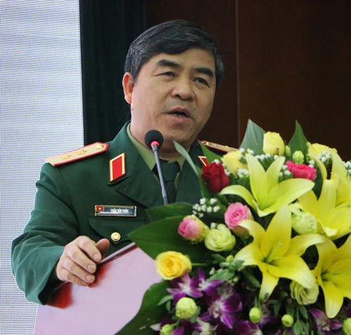 Trung tướng, PGS, TS Trần Hữu Phúc, Cục trưởng Cục Nhà trường, Bộ Tổng tham mưu phát biểu tại hội thảo.