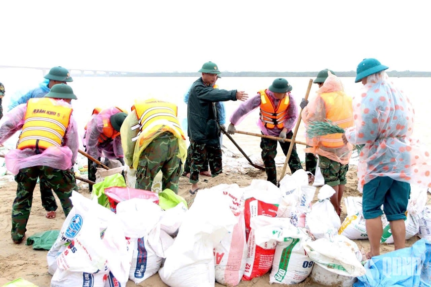 Hàng nghìn bao cát, thùng nước cùng hàng trăm cọc gỗ, dây thừng đã được đơn vị vận chuyển đến các trường học, trụ sở chính quyền, các công trình công cộng và nhà dân để chằng chống; đến các bờ sông để gia cố tình trạng sạt lở.