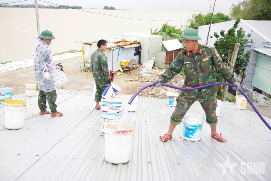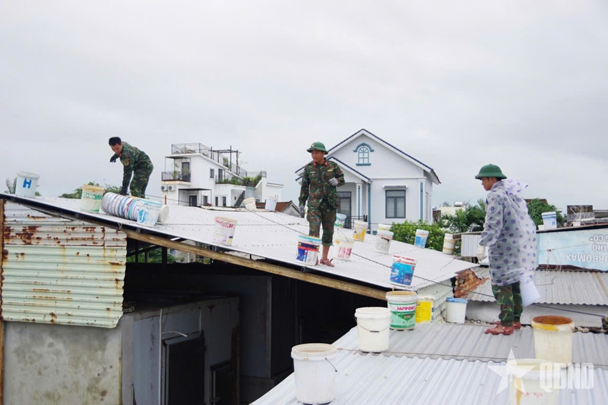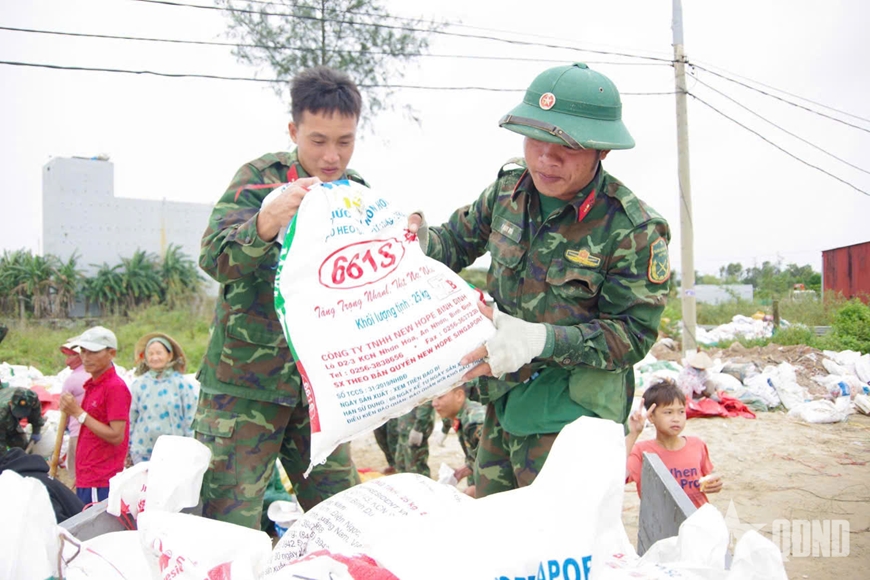 Cán bộ, chiến sĩ Sư đoàn 315 khiêng cát, hỗ trợ người dân chằng chống nhà cửa trước khi bão 13 đổ bộ.