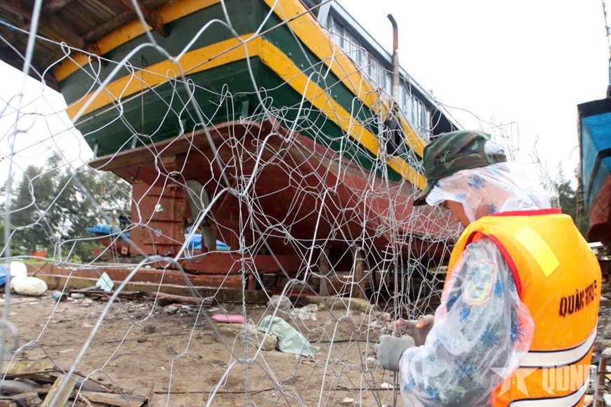 Tại Xưởng sửa chữa tàu Trường Đà cuối hạ lưu sông Thu Bồn, gần 100 cán bộ, chiến sĩ khẩn trương gia cố, bảo vệ hàng chục tàu cá của ngư dân đang trong thời gian bảo dưỡng, sửa chửa. Địa điểm này bị thiệt hại nặng trong đợt mưa lũ lịch sử vừa qua. Cán bộ, chiến sĩ Sư đoàn đã dùng bao tải cát, rọ lưới, bạt chắn nước để tăng cường gia cố bờ xưởng và tàu thuyền nhằm tăng sức chống chịu với gió to, sóng biển mạnh.