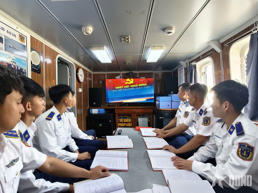 | Cán bộ, chiến sĩ Tàu CSB 4038 tổ chức học tập, quán triệt và theo dõi Đại hội Đảng. |