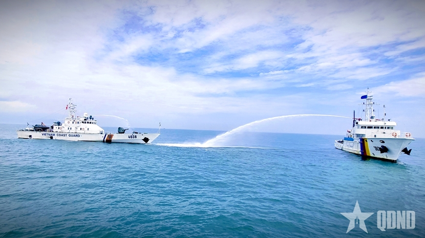 | Tàu CSB 4038 phối hợp với các lực lượng thực hiện nhiệm vụ diễn tập trên biển. |