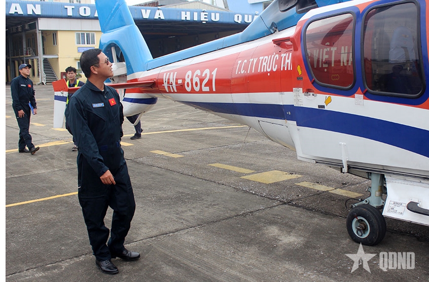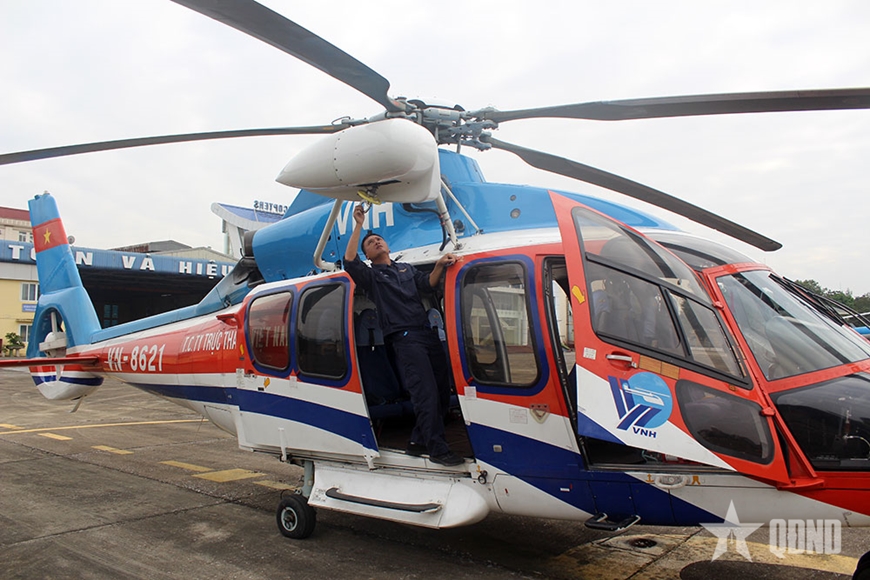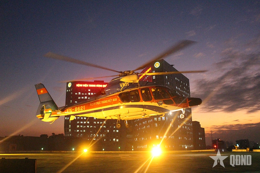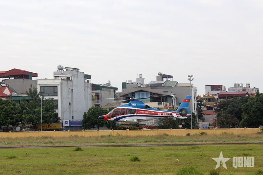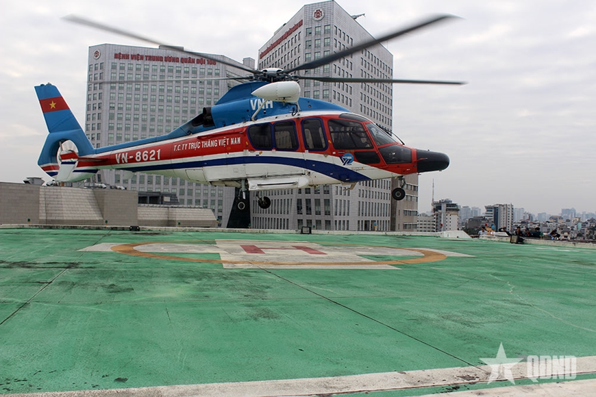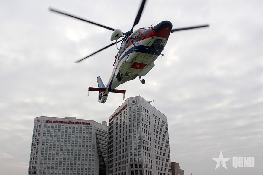 Tổ bay EC-155B1 cất, hạ cánh tại nóc nhà cao tầng của Bệnh viện Trung ương Quân đội 108.