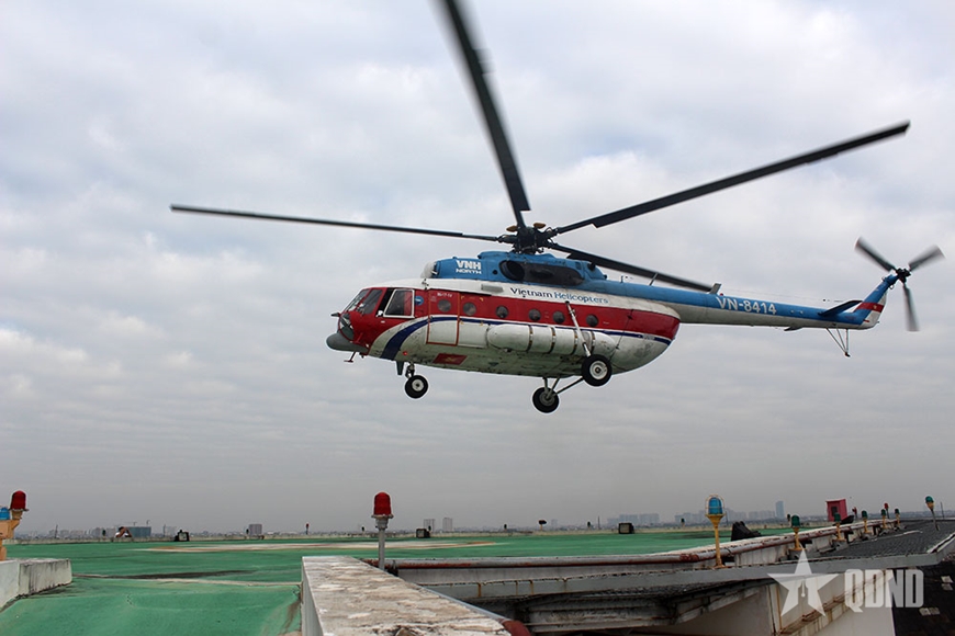 Trực thăng huấn luyện của Công ty Trực thăng miền Bắc cất, hạ cánh trên nóc nhà cao tầng của Bệnh viện Trung ương Quân đội 108.