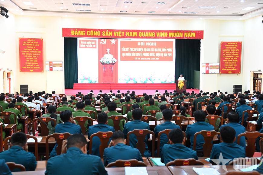 Báo cáo cho thấy, năm 2025, UBND TP Cần Thơ đã chủ động tham mưu cho Thường trực Thành ủy, HĐND thành phố lãnh đạo, chỉ đạo hoàn thành khá toàn diện các mặt công tác quân sự, quốc phòng. Nổi bật là việc sắp xếp tổ chức quân sự địa phương theo mô hình chính quyền 2 cấp; thực hiện đạt và vượt nhiều chỉ tiêu nghị quyết; duy trì nghiêm chế độ sẵn sàng chiến đấu; nắm chắc tình hình, tham mưu xử lý kịp thời các tình huống, giữ vững an ninh chính trị, trật tự an toàn xã hội trên địa bàn.