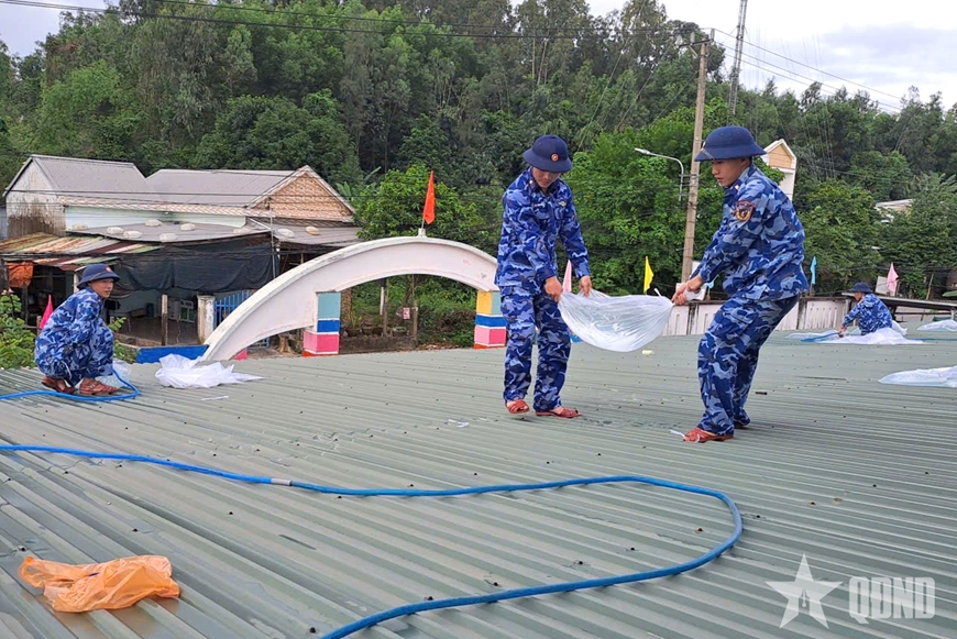 | Cán bộ, chiến sĩ Hải đội 23, Bộ tư lệnh Vùng Cảnh sát biển 2 hỗ trợ trường học trên địa bàn đóng quân ứng phó bão Kalmaegi. |